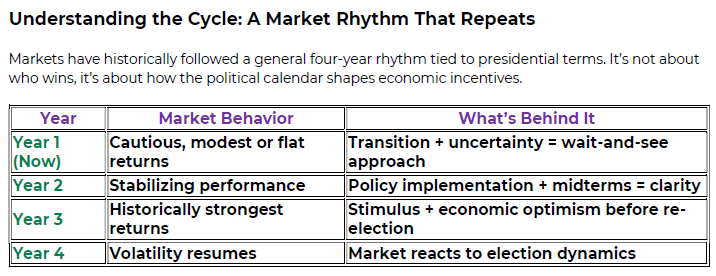 That’s why Year 1 of a presidential cycle tends to be more cautious and uneven in market performance. Investors are watching carefully as new policies take shape, agendas are tested, and leadership settles in.